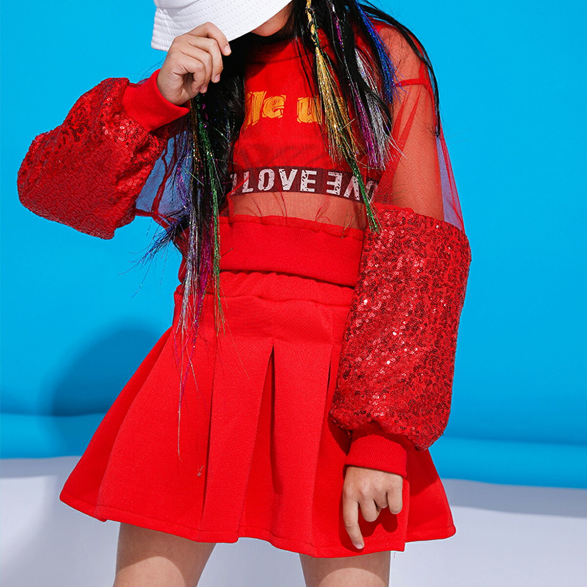 スパンコール セットアップ レッド チアガール 3点セット トップス ブラトップ スカート 120cm 130cm 140cm 150cm 160cm キッズ ダンス ダンス衣装 HIPHOP ジュニア 女の子 子供服子供服yuai