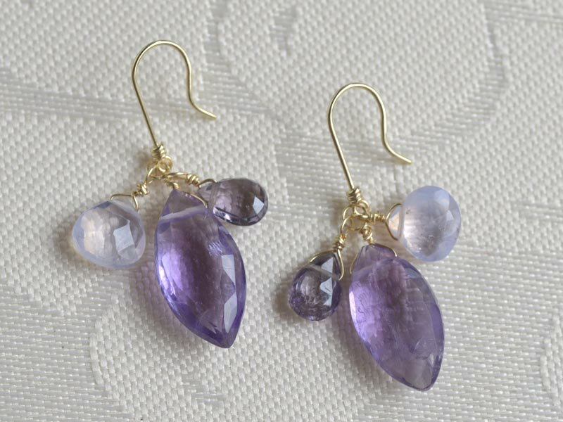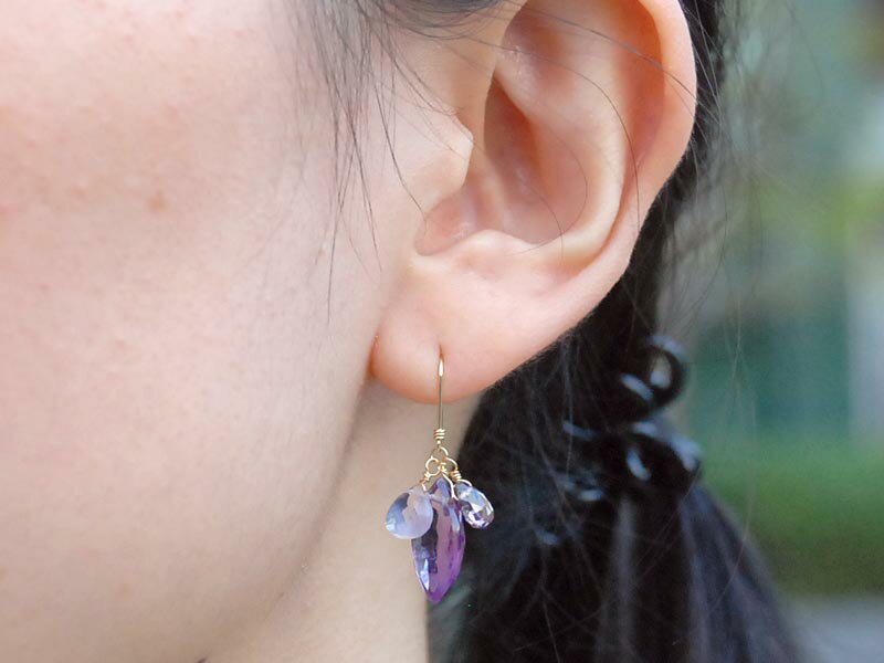 長さ:約16mm(金具含まず) 素材:アメシスト・スピネル・クォーツ・K18 金具:ピアス K18フック式 日本製